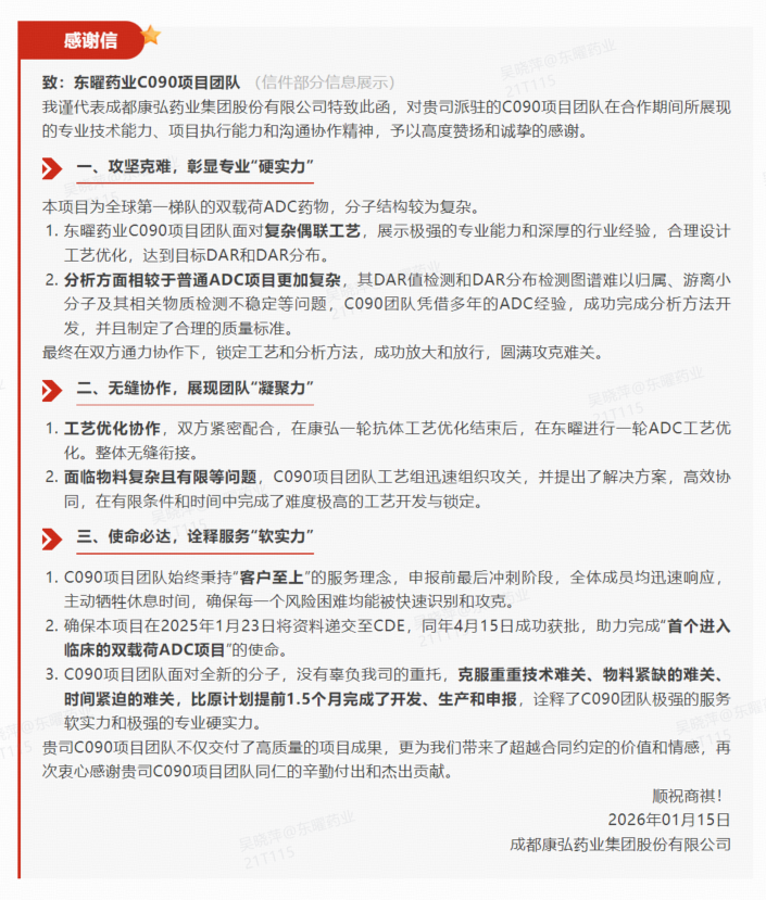 近日,东曜药业收到了来自成都康弘药业集团股份有限公司(康弘药业)的一封特别感谢信,感谢C090项目团队在KH815双载荷ADC研发项目中的突出贡献和全心付出。康弘药业自主研发的KH815于2025年3月21日获得澳洲HREC批准,并于2025年4月15日成功获得中国临床批件,成为